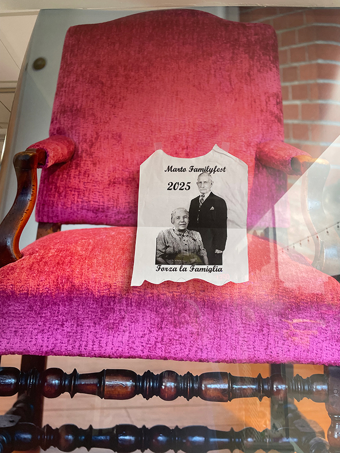 To honor my ancestors, I installed an enlarged image of my reupholstered WASP grandfather’s chair. Adhered to it is a xeroxed tee shirt with a photo of my Sicilian Nonna & Nonno.